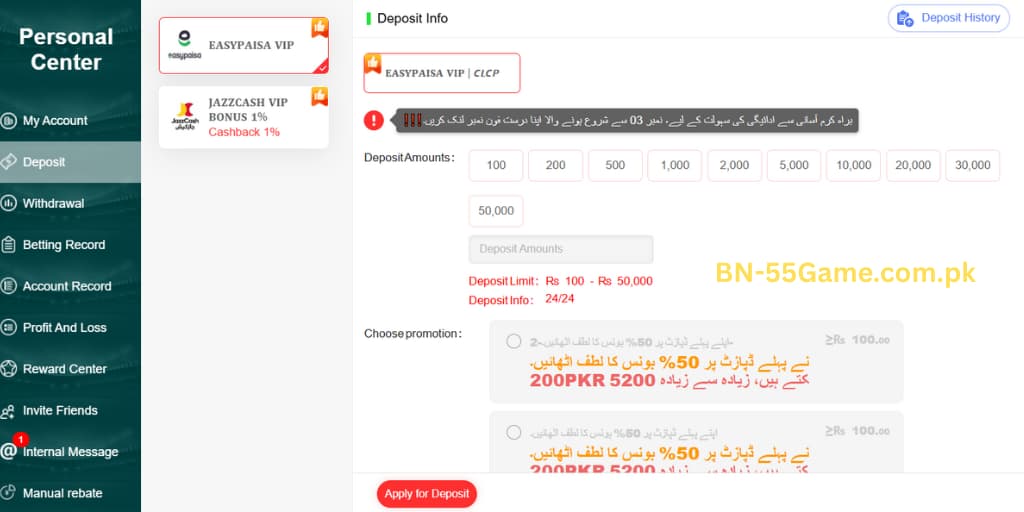 Depositing money in the BN 55 app is very simple. Players need to log in, open the Wallet option, and select their preferred method such as Easypaisa, JazzCash, or Bank Transfer.